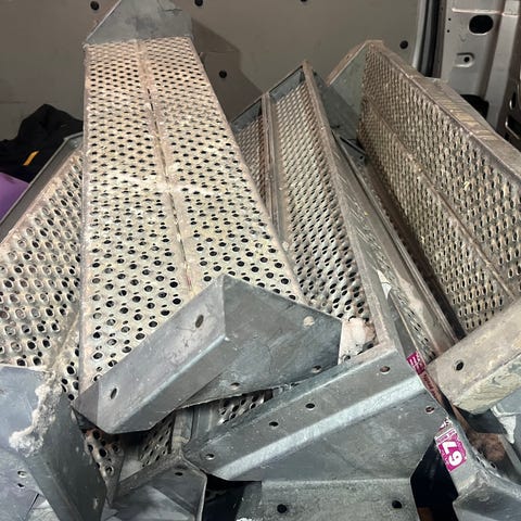 Metallstativ med flere rørfester montert langs en bunnplate. De kan skrus fast i gulv eller underlag gjennom ferdige skruehull i endene av platen. Passer til bruk i lager, verksted eller andre områder der det er behov for fast montering og organisert oppbevaring av utstyr eller deler. Antall stativ og nøyaktige mål kommer.