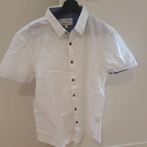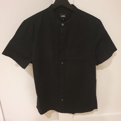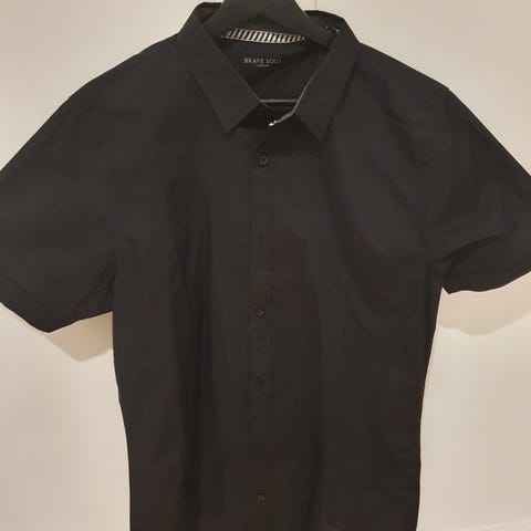 Skjorte for herre i størrelse M. Modellen har korte ermer og knappelukking foran. Fargen er svart. Passer til hverdagsbruk eller enklere penere anledninger, og kan brukes alene eller under genser eller jakke.