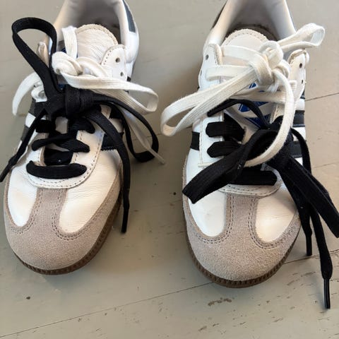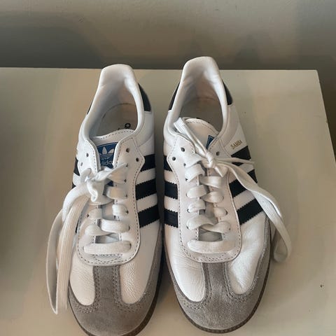 Adidas Samba sneakers i størrelse 39 1/3. Modellen har svart overdel med hvite striper og lyse semskede detaljer i front. Yttersåle i gummi. Lite brukt og få bruksmerker. Kan hentes i Oslo/Tøyen eller sendes på kjøpers regning.