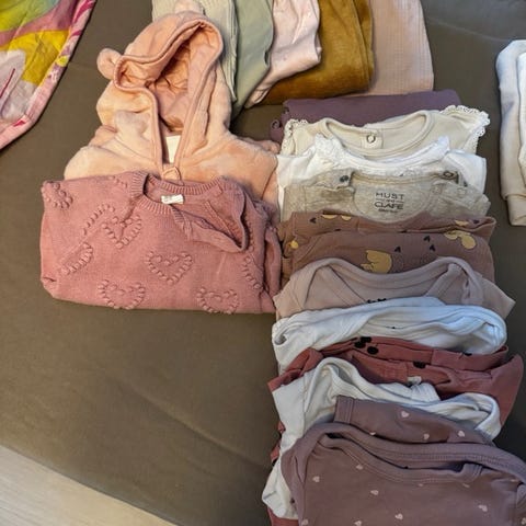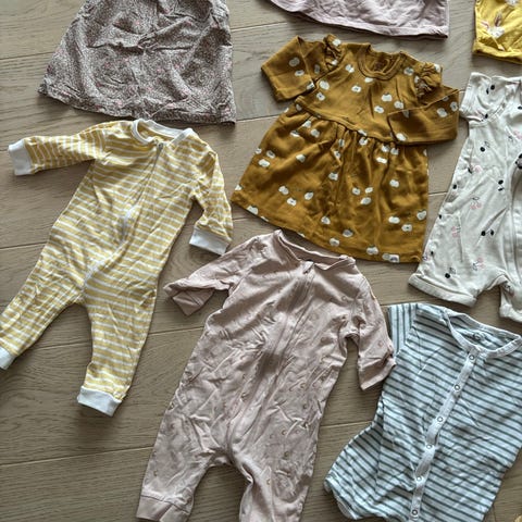 Fargene går i rosa, hvitt, beige, grønt og denim. Klærne passer til hverdagsbruk for baby i størrelse 68 og kan kombineres på flere måter etter behov.
