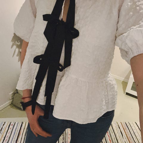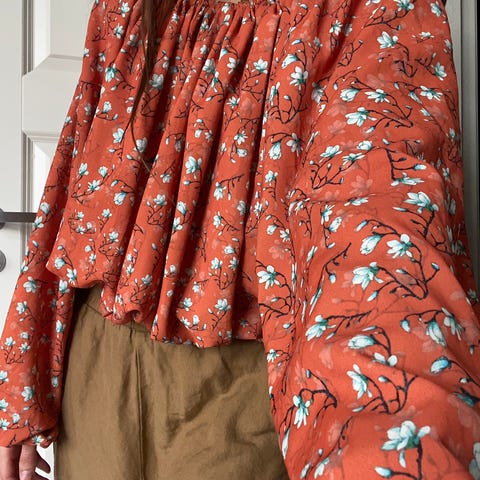 Vero Moda topp for dame i størrelse M. Toppen er hvit med små blomstermønster og er laget av bomull. Den har rynkedetaljer og blondefelt foran, samt lett voluminøs passform. Ermene er korte med lett volangkant, og halsen har en enkel rund fasong med liten rysjekant. (Strykes før levering)