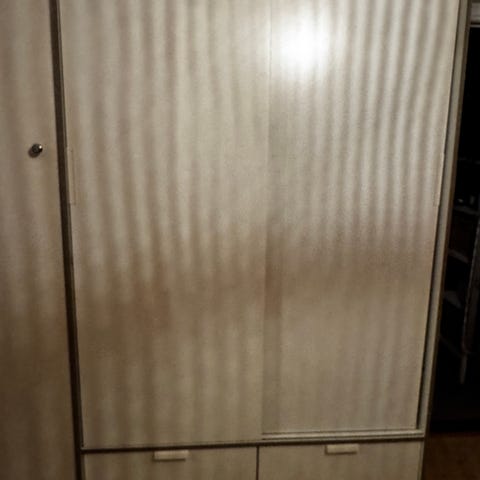 Skapet er pent brukt med unntak av flekker i bunnen og i nederste skuff.