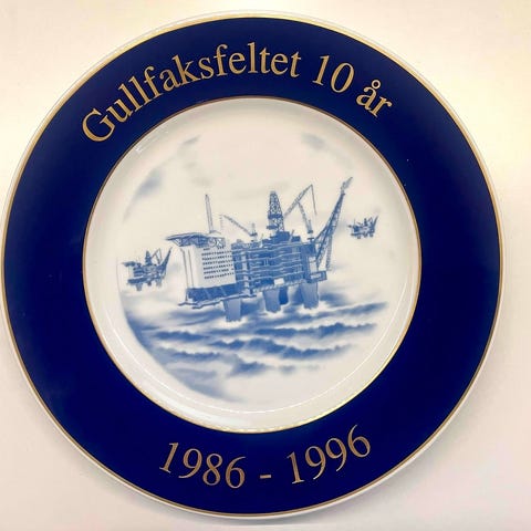 Gullfaks A veggtallerken sommeren 1987 blå og hvit porselen