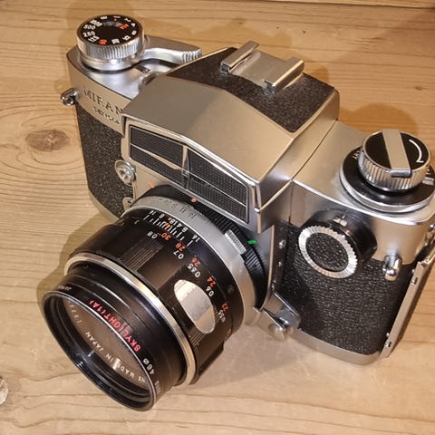 Ihage Exakta analogt kamerautstyr med objektiv og tilbehør.