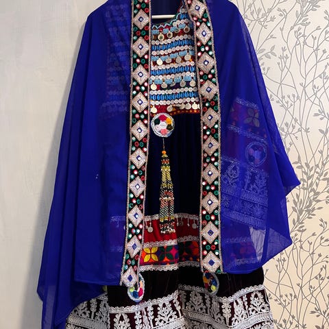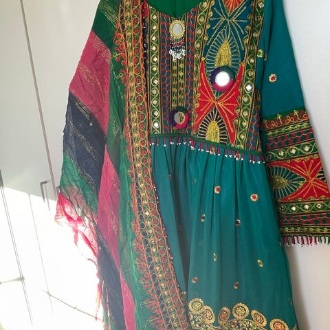 Nydelig tradisjonell afghansk kjole med vakre håndbroderte detaljer på overdelen. Kjolen har lange ermer og et luftig, komfortabelt snitt. Perfekt til fest, kulturelle arrangementer eller spesielle anledninger.