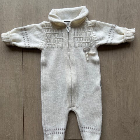 Lillelam heldress for barn i størrelse 62. Dressen er i hvit merinoull. Selges fordi den har blitt for liten. Har sydd noen små hull på dressen og i kragen. Bortsett fra det er den fortsatt fin og har mye bruk igjen✨