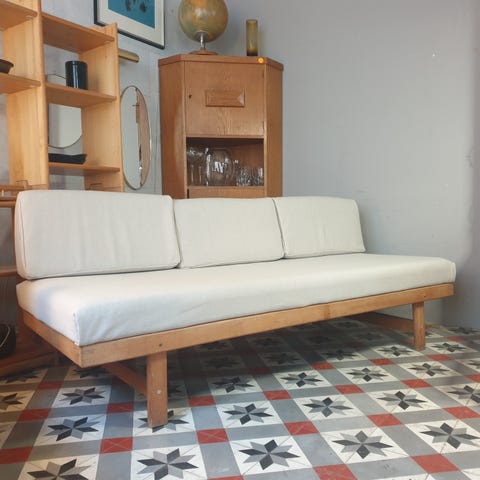 3-seter sofa tegnet av Erik Wørts i eik. Nye puter i Hallingdal fra GU