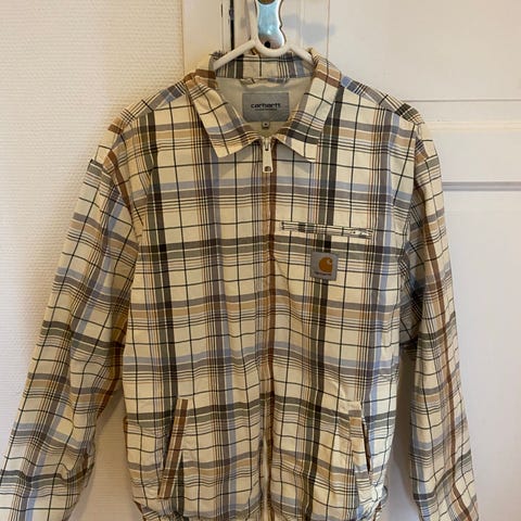Jakken er laget i bomull og har et flerfarget kamuflasjemønster. Den har krage, knappelukking i front og flere lommer, blant annet brystlomme med Carhartt-logo.