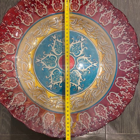 Arabia dekorativ tallerken med blomsterdekor. Tallerkenen har flerfarget blomstermotiv i midten og bølget kant med dekor langs kanten. Egnet som veggpynt eller som dekorativt serveringsfat. Laget i porselen/keramikk med opphengssnor festet på baksiden og Arabia-stempel.