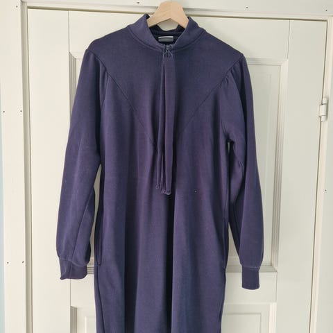 Kjolen er i en nydelig blåfarge og har lange ermer. Den har glidelås i front og ribbekant nederst på ermene. Passer som en komfortabel hverdagskjole i mykt bomullsmateriale.