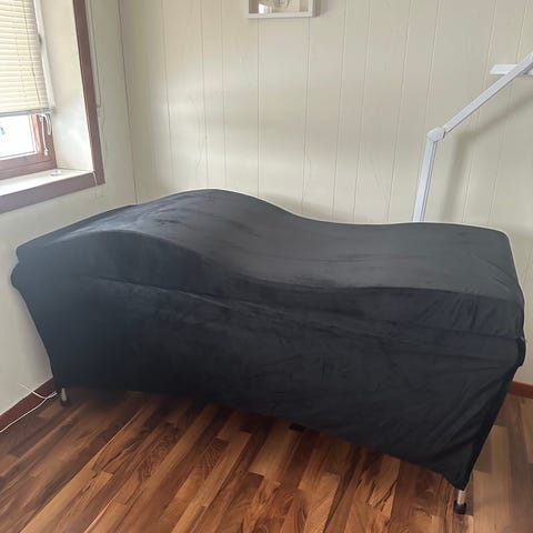Selger min elskede behandlingsbenk. Den har hjul, og kan sendes og heves elektrisk. Jeg har klipt til en overmadrass som har blitt brukt hele tiden, som gjør sengen behagelig å ligge på over tid. Den er 75 bred og 200 lang, men laken på 90x200 passer godt.