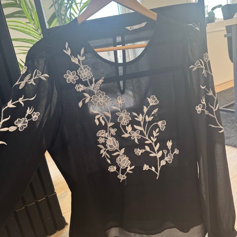 Cubus bluse for dame i størrelse 34. Blusen er svart og laget i polyester. Den har lange ermer og detaljer med blondefelt ved hals og mansjetter. Passer til bruk i hverdagen, på jobb eller til mer pyntede anledninger.