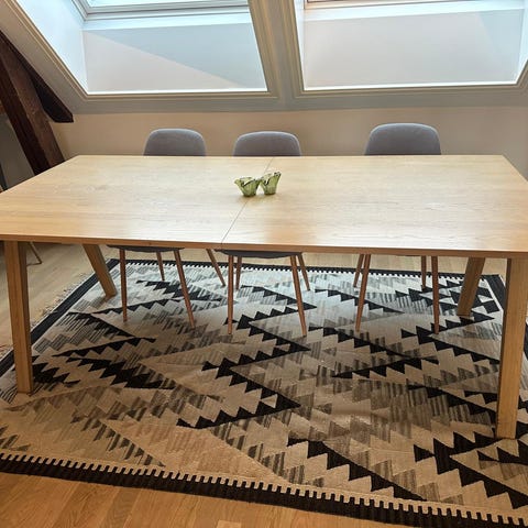 Spisebord med ileggsplate fra Skeidar selges billig. Bordet har noen flekker som kan ses på bildene. Ileggsplaten er i godt skikk og forlenger bordet til totalt 250cm langt.
