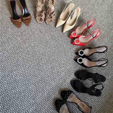 Alt i skinn og lite brukt. Sorte blå, beige og gullsko med litt hæl