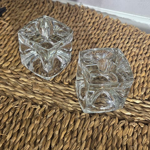 Fire kubelysestaker i massivt krystallglass fra tsjekkiske Rudolfova Huť (Sklo Union), designet av Rudolf Jurnikl. Klassisk 60–70-talls modernisme med rene linjer og tung, klar kvalitet.