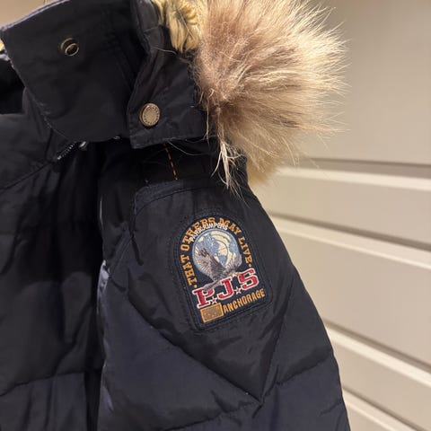 Den har to små skader/rifter på baksiden og mangler Parajumpers merket som skal være på armen.
