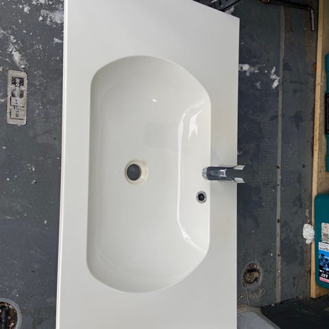 Servant i støpemarmor/mineralmarmor: målene er: lengde 92 cm og bredde 51 cm, dybde ca. 7 cm, ny pris oppgitt ca. 3 500 – 7 000 kr