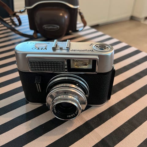Selger en flott Yashica Electro 35 GS med lyssterk 45mm f/1.7 Color-Yashinon optikk. Dette er en populær 70-talls rangefinder med blenderprioritet (Auto) og elektronisk styrt lukker – kjent for skarp optikk og nydelig analog look.