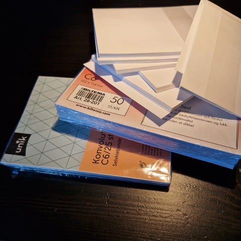 Konvolutter i gullfarget papir. Egnet til bruk sammen med kort, invitasjoner eller hilsener. Fargen gir et mer høytidelig preg, for eksempel til bryllup, konfirmasjon eller andre anledninger. Str B6, 89 stk