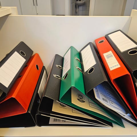 Ringpermer A4 i blandede farger og materialer. Pakken inneholder permer i brun papp samt blå og svart plast. Egnet for oppbevaring og organisering av dokumenter i A4-format på kontor, skole eller hjemme.