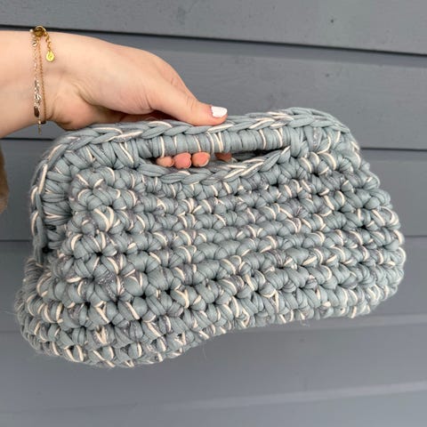 Heklet veske i bomull. Bøylen er 19 cm bred. Høyde når den ligger flat 19 cm. Høyde ca. 14 cm når den står. Vesken er ikke brukt.