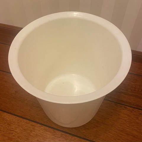Stor blomsterpotte i grå/svart farge. Potten har konisk form med bred åpning og smalere bunn. Egnet til planting av blomster, busker eller mindre trær på terrasse, balkong eller i hage. Innsiden viser rester etter tidligere bruk til jord/planter. Materialet fremstår som hardt og værbestandig, egnet for utendørs bruk.