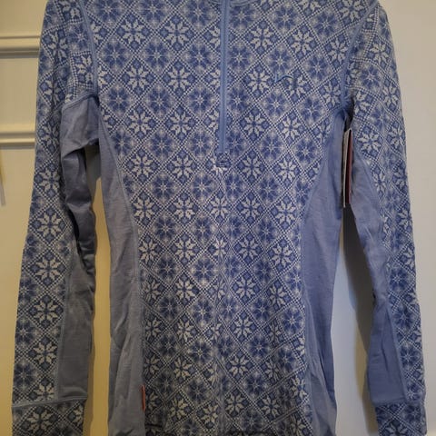 Kari Traa ullundertøysett for dame i størrelse XL. Sett med overdel med halv glidelås og matchende underdel. Plaggene har jacquardmønster i blått og offwhite med røde detaljer. Materialet er 100% ull, egnet som innerste lag. Passer til bruk som ullundertøy eller baselayer ved ulike utendørsaktiviteter og til hverdagsbruk når det er behov for et varmt lag innerst.