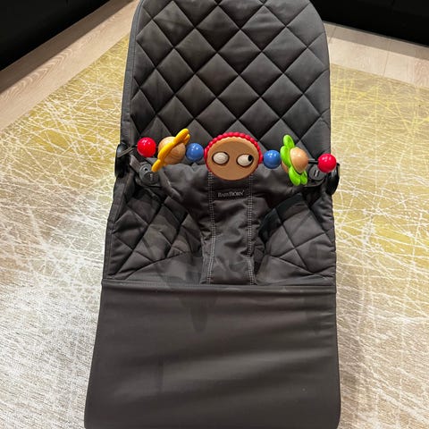 Pent brukt vippestol fra Babybjörn. Leke følger med, babyen elsker den! Trekket kan tas av og vaskes i maskin.