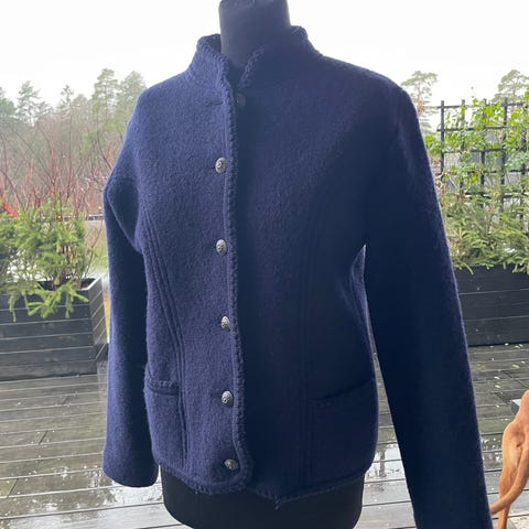 Kvalitetsjakke fra Østerriske Geiger i 100% ull. Fargen er nydelig blålilla. Ingen slitasje e.l. Kan passe en S- M, liten L? 🌷