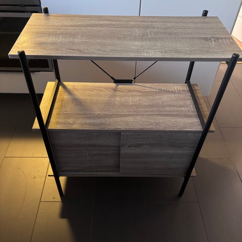 Få bruksmerker men selges billig da skyvedørene er litt ustabile. De fungerer utmerket men det er en litt for stor åpning mellom hyllen og skapdørene. Litt usikker på hvor den er kjøpt men tenker at det kan være Jysk.