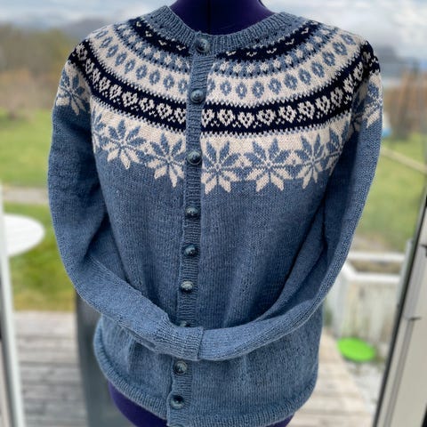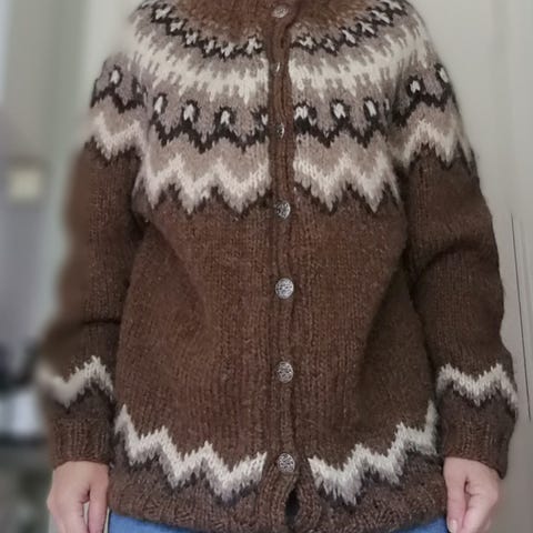 Kvalitetsstrikk med fin passform. Brukt få ganger. Perfekt som god og varm kofte på kalde dager, høst, vinter og vår,-