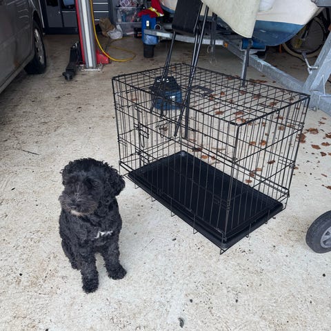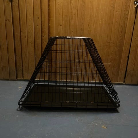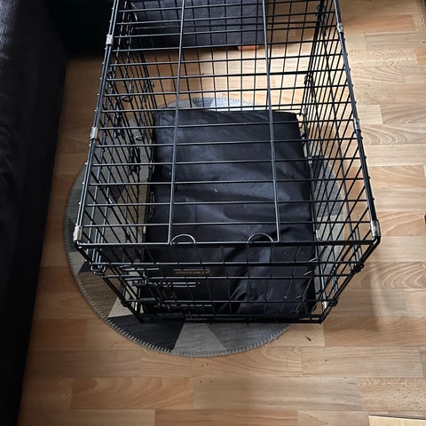 Sammenleggbart hundebur i metall med svart finish. Buret har gitterkonstruksjon og uttakbar bunn som gjør det enkelt å rengjøre. Målene er ca. 60 cm i bredde og 71 cm i høyde, egnet for mindre til mellomstore hunder avhengig av rase og størrelse. Kan brukes hjemme, i bil eller på reise som et trygt oppholds- og hvileområde for hunden.