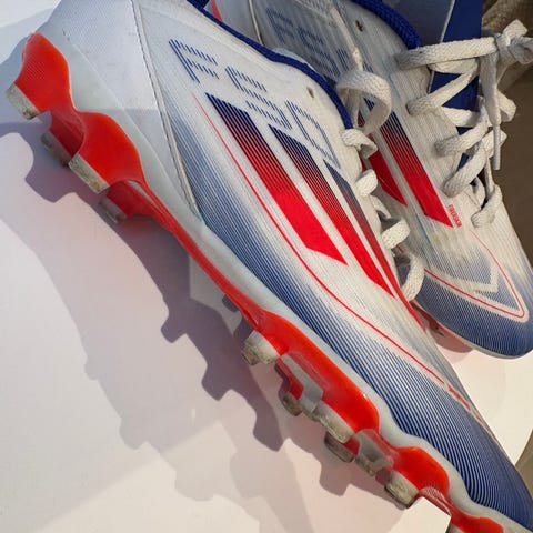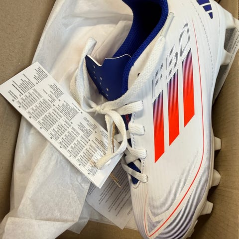 Adidas F50 fotballsko i hvit, blå og rød farge. Skoene har snøring og knotter til bruk på gress- eller kunstgressbane. Overdelen er i syntetisk materiale som er lett å rengjøre. Yttersålen har faste knotter for godt grep på banen. Passer til fotballtrening og kamp. Kjønn ikke spesifisert. Str 38 2/3