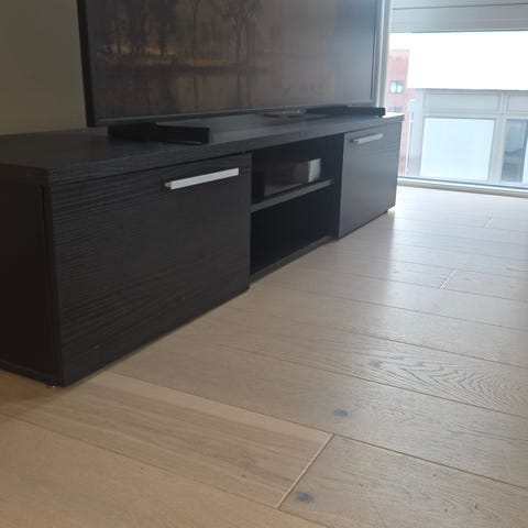 Tv-benken er godt brukt, og det er vist en ripe på ett av de siste bildene i annonsen. Det mangler også en vegg bak tv-benken på den ene siden da vi har hatt ledninger fra tven og ned til tv-boks osv. Innvendig er det delt opp i to hyller🫶🏼
