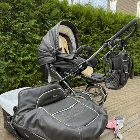 Emmaljunga kombi barnevogn. Vognen har justerbart håndtak, kalesje, innebygd myggnetting og solskjerming og varekurv under. Vognen er grå med mørke og lyse detaljer. Passer fra nyfødt med liggedel og videre som sportsvogn med sittedel. Vognen har fire hjul og ramme i metall med tekstiltrekk på seter og liggedel, som kan vaskes i maskin. Myggnetting, stelleveske og Voksi pose følger med. Det er slitasje på håndtak, og hjulene er slitte, men fungerer som den skal. Må hentes i Vestfossen.