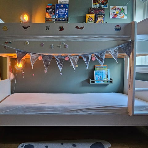 Godt bygget køyeseng, som vil vare lenge. Laget av Talgø Møbelfabrikk AS for Skeidar. Ribbebunner følger med, mens madrasser må kjøpes separat. Det er slitasjemerker i lakken her og der og det er lim etter klistremerker. Ingen skader, så den fremstår ok. Madrass størrelse er 90x200, så voksne kan fint ligge i den. Gavel er 161 høy. Har demontert den.