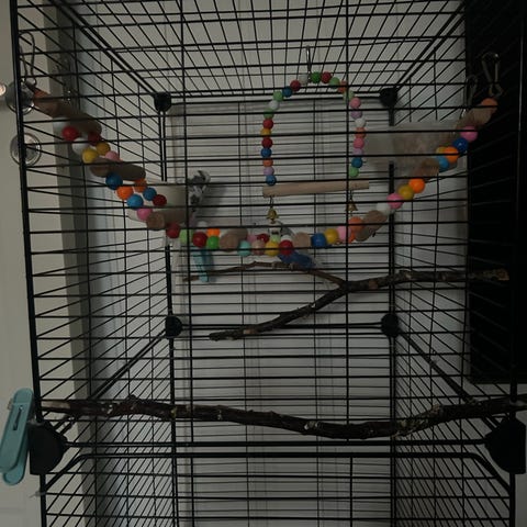 Bur, utstyr og en del mat er inkludert i prisen. Buret var nytt i fjor og er ganske stort.