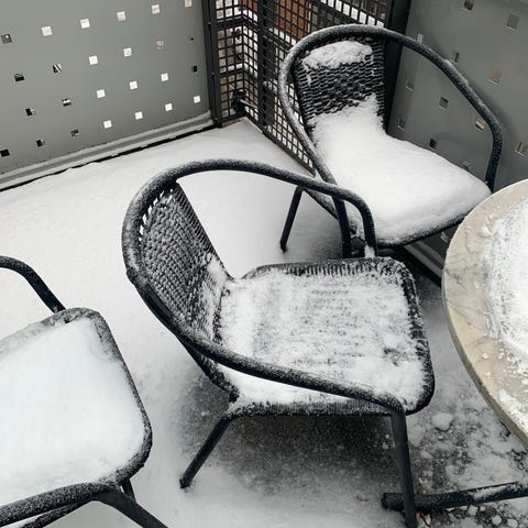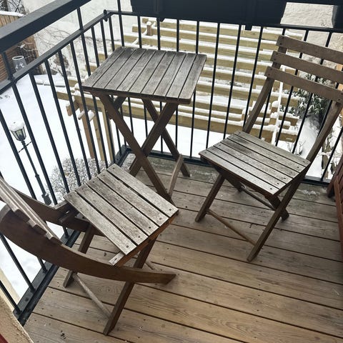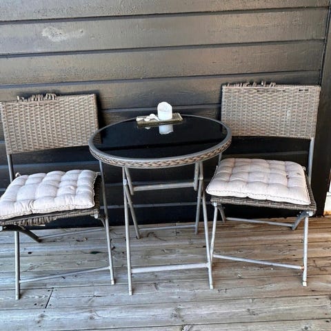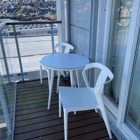 Balkongsett med rundt bord og to klappstoler i hvitlakkert metall. Bordet har rund bordplate og sammenleggbart understell. Stolene har ryggstøtte og sete i samme materiale, også sammenleggbare for enkel lagring. Egnet for bruk på balkong, terrasse eller liten uteplass.