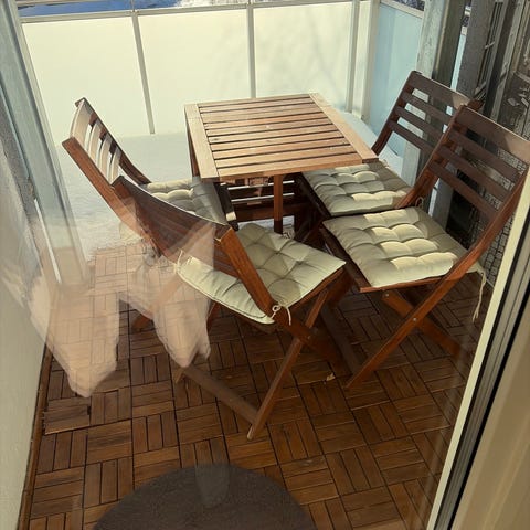 Balkongsett rundt bord og klappstoler hvit metall