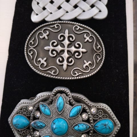 Beltespenner rektangulære i metall med dekorativt mønster og blå stein i midten. Settet består av én beltespenne i gullfarget metall og én i sølvfarget metall. Begge har gravert ornamentikk på både for- og bakside og standard festeanordning for belterem. Passer til unisex bruk og kan brukes på ulike typer belter der spennen kan byttes ut.