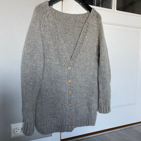 Nydelig lyngfarget hjemmestrikket cardigan, ca størrelse small.