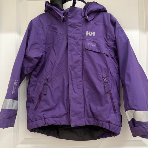 Tykk og varm "Helly Hansen" vinterjakke barn str. 104 (4 år) Slitesterkt ytter materiale. Avtakbar hette. Halvblank i stoffet. Sollyset får den til og se mer blank ut.