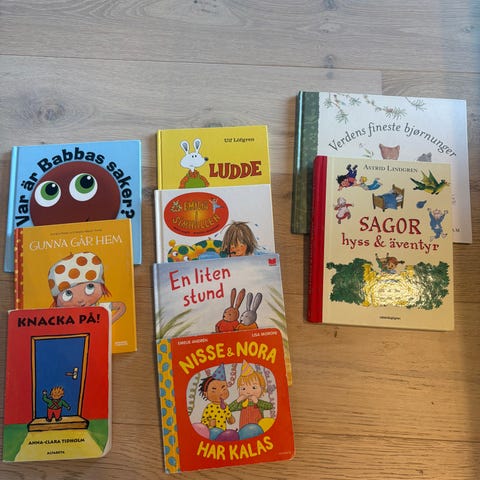 Pakke med barnebøker fra Goboken og andre forlag. Bøkene er for små barn og inneholder enkle historier, rim og faktatekster om blant annet dyr, kjøretøy og farger. Flere av bøkene er kartongbøker tilpasset små barnehender. Egner seg til høytlesning og tidlig lesetrening for barn i førskolealder.