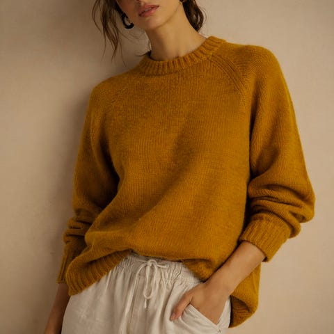 Strikket genser med oversized passform. Genseren er kamelbrun og har finstrikket kvalitet. Den har rund hals, langt erme, normal lengde og ribbestrikk ved ermeslutten og i nedre kant.materialer Acrylic 52%, Polyester 25%, Ull 14%, Alpackaull 7%, Elastan 2%