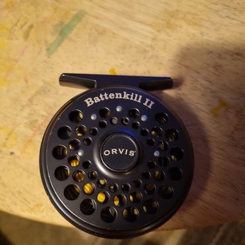 Orvis Helios 9’ #8 som denne brukt med. Noen kosmetiske skavanker, men ikke noe som utgjør noe forskjell på funksjon eller aksjon. Har røret, men finner ikke posen. Selges samlet for 5500,- grisebillig stang rig til veil. 22.000,-