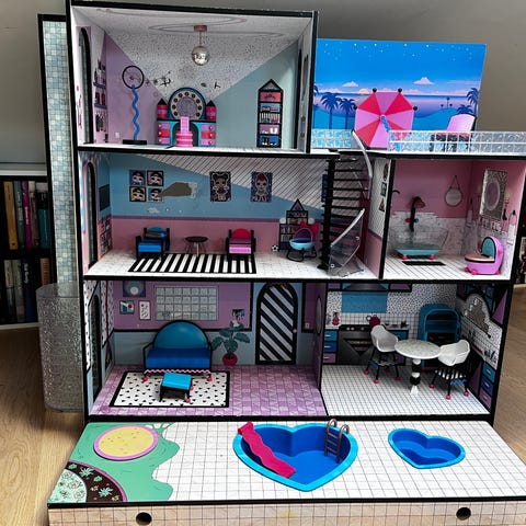 L.O.L. Surprise dukkehus med flere etasjer og rom, inkludert soverom, bad, stue, kjøkken og lekeområde.