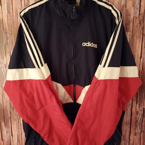Fila joggedress for herre i størrelse S. Sett med jakke og bukse i lett stoff. Jakken har glidelås foran, høy krage og elastisk linning nederst og ved ermene. Fargekombinasjon med blå base og røde og hvite felt, samt Fila-logo på brystet. Buksen er blå med elastisk linning i livet og rette ben. Diskré Fila-logo på benet. Egnet som fritids- eller treningsplagg.