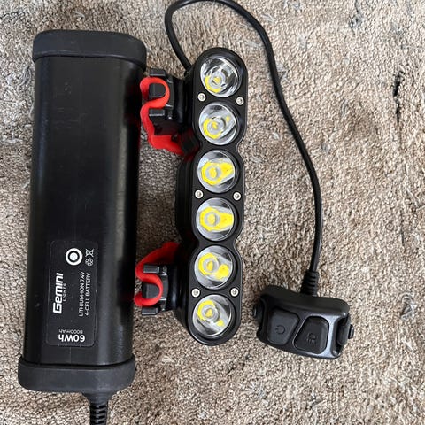 6 LED-lys i aluminiumhus, fjernkontroll, 60 Wh (8000 mAh) 4-cellers litium-ion batteripakke, ladekabel, forlengerkabel, ulike stropper og fester samt oppbevaringsetui