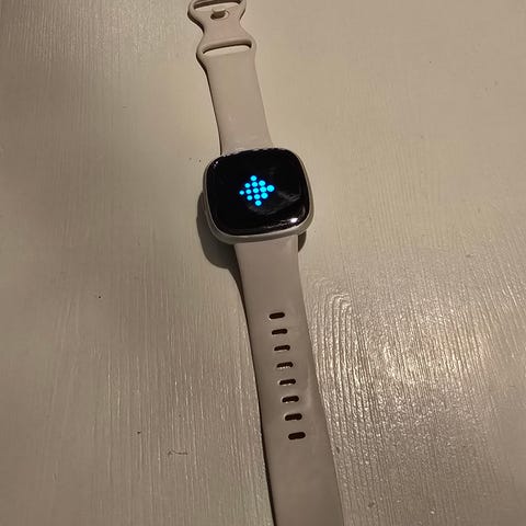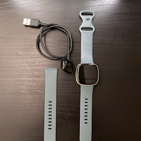 Fitbit Versa smartklokke med hvit silikonreim. Klokken har firkantet berøringsskjerm og sensorer på undersiden for aktivitets- og helsemåling. Leveres med ladekabel med USB-tilkobling.