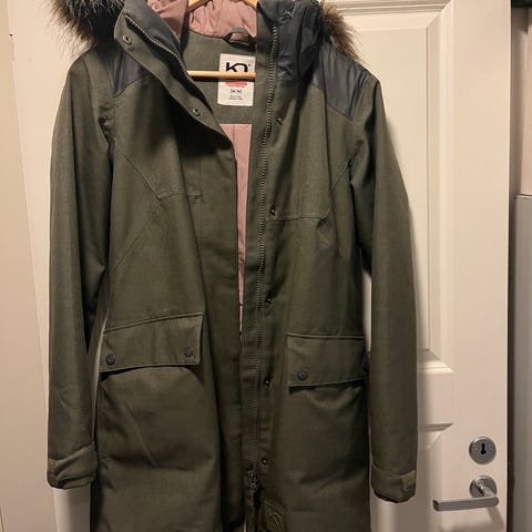 Nesten ubrukt vinter-/vårjakke. Mørkeblå farge. Teddyfor i hetten